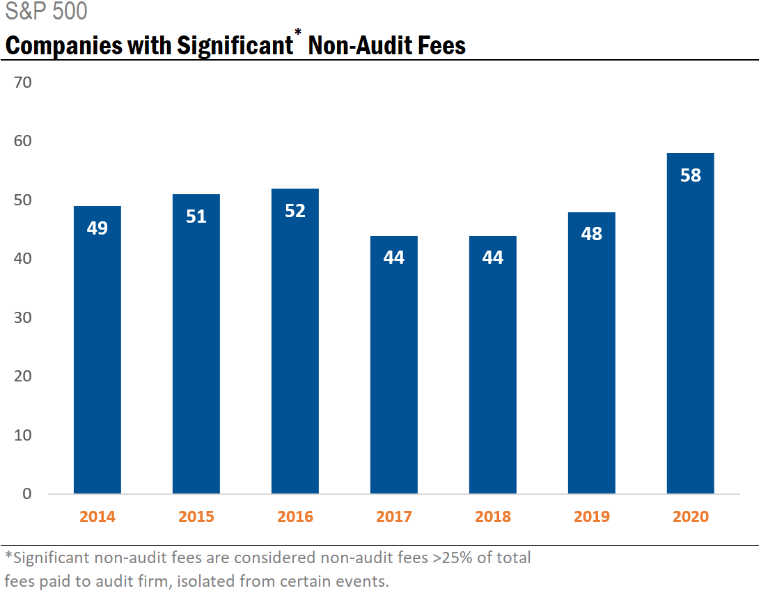Only 58 companies in the S&P 500 disclosed non-audit fees exceeding 25% of total audit fees paid in 2020. The number of companies disclosing significant non-audit fees has fluctuated in recent years, with 2020 representing a high-point.