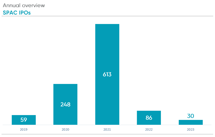 Special Purpose Acquisition Company (SPAC) IPOs continue to decrease after the SPAC boom of 2021. There were only 30 SPAC IPOs in 2023, a 65% decrease from 2022. Together, these SPAC IPOs raised nearly $3.4 billion, an average of $113 million per IPO.