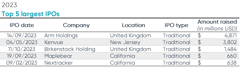 Arm Holdings PLC was the largest IPO in 2023. The UK-based leader in CPU technology raised $4.8 billion from its listing on NASDAQ in September. While it was the leading IPO for 2023, Arm Holdings was also the fifth largest IPO since 2019.
