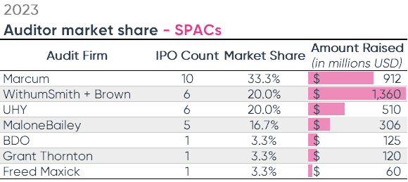 In total, seven firms audited the 30 SPAC IPOs completed in 2023.