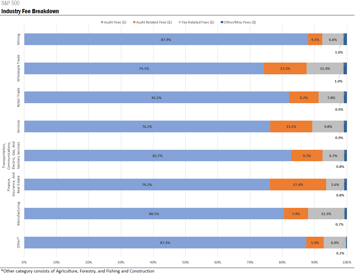 The chart below displays the percentage amounts each fee category contributed to total fees by industry of the S&P 500 companies for the fiscal year 2021.