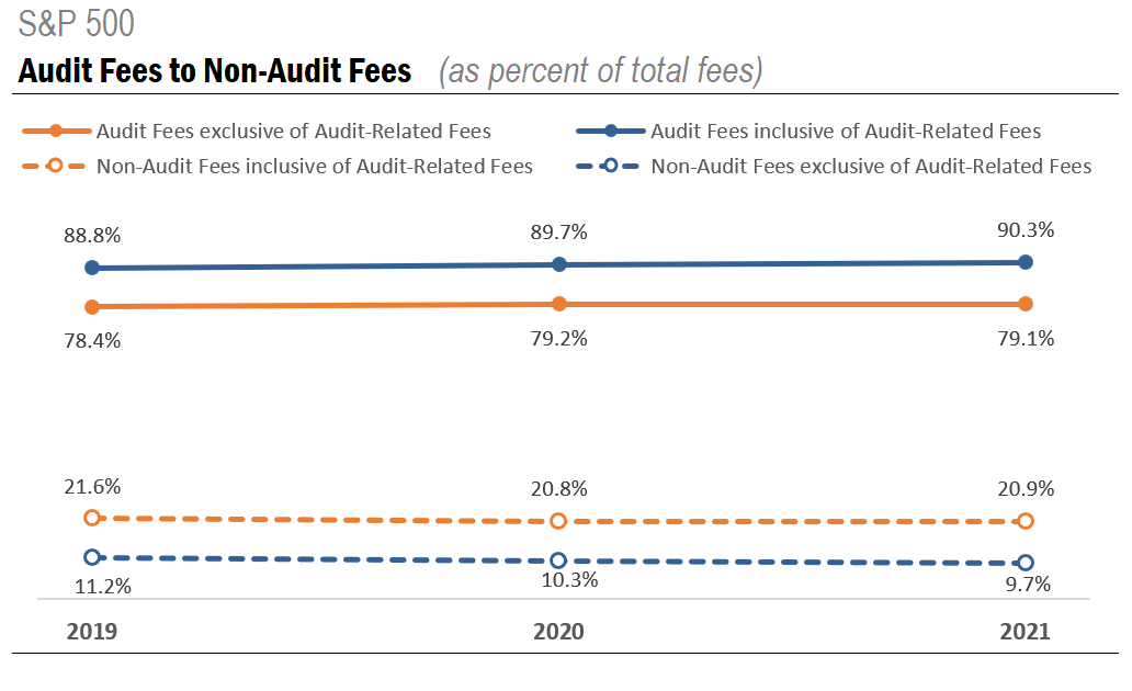 In general, audit fees that are inclusive of audit-related fees have steadily contributed about 90% of the total fees paid by the S&P 500 from fiscal years 2019 to 2021. Comparatively, audit fees exclusive of audit-related fees contributed just under 80% of total fees over the last three years. These amounts changed little from one year to the next.
