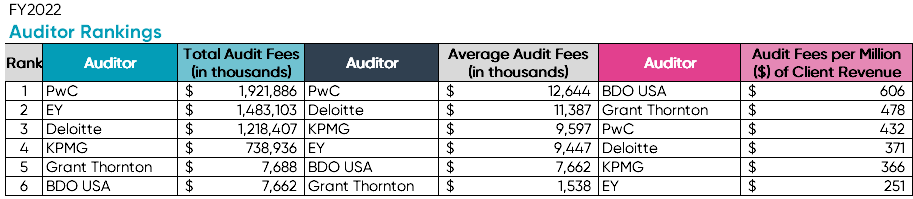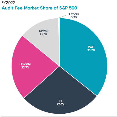Typically, large-accelerated companies are audited by one of the Big Four firms. Consequently leading them to dominate the S&P 500 audit fee market share. In FY2022, there were a total of six firms that audited the index: the Big Four, Grant Thornton and BDO USA.