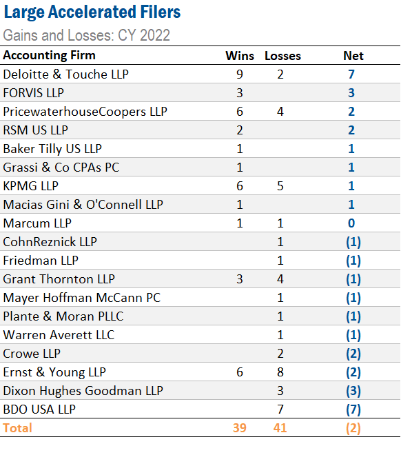eloitte was the leader for new large accelerated filer clients in 2022, gaining a net of seven clients throughout the year. FORVIS followed with three new clients. BDO saw the most net losses, losing seven large accelerated clients in 2022.