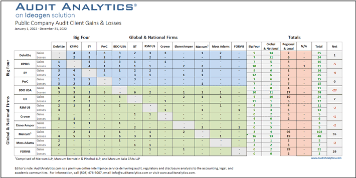 Marcum saw substantial net gains in 2022, adding 55 new clients overall. FORVIS gained a net of 29 clients, with only two departures during the year. Grant Thornton also saw an overall gain of seven clients in 2022.