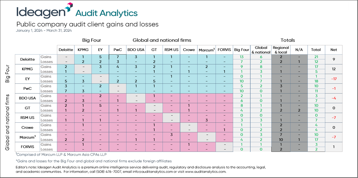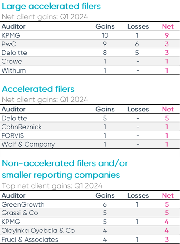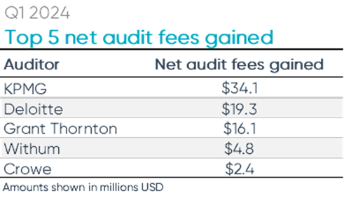 Overall, the top 10 global and national audit firms gained 79 and lost 93 clients during Q1 2024.