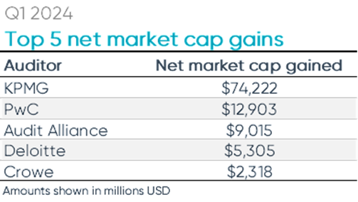 KPMG was the leader for net SEC audit client gains in the first quarter of 2024. The Big Four firm added 17 new public company clients and lost five for a net gain of 12 clients during the quarter.