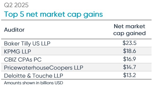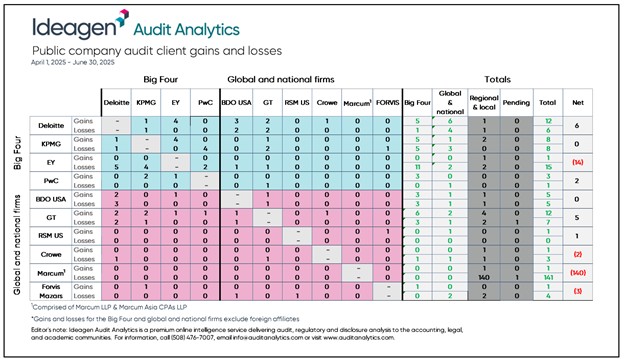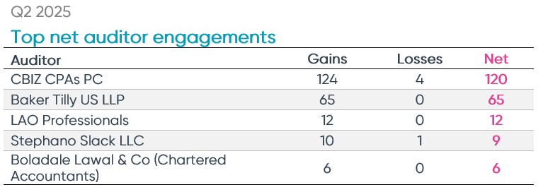 Marcum, for the second quarter in a row, had the most net audit client losses in Q2 with 141 departures. Marcum’s losses this quarter were a result of the merger with CBIZ CPAs, who engaged 124 of these clients.