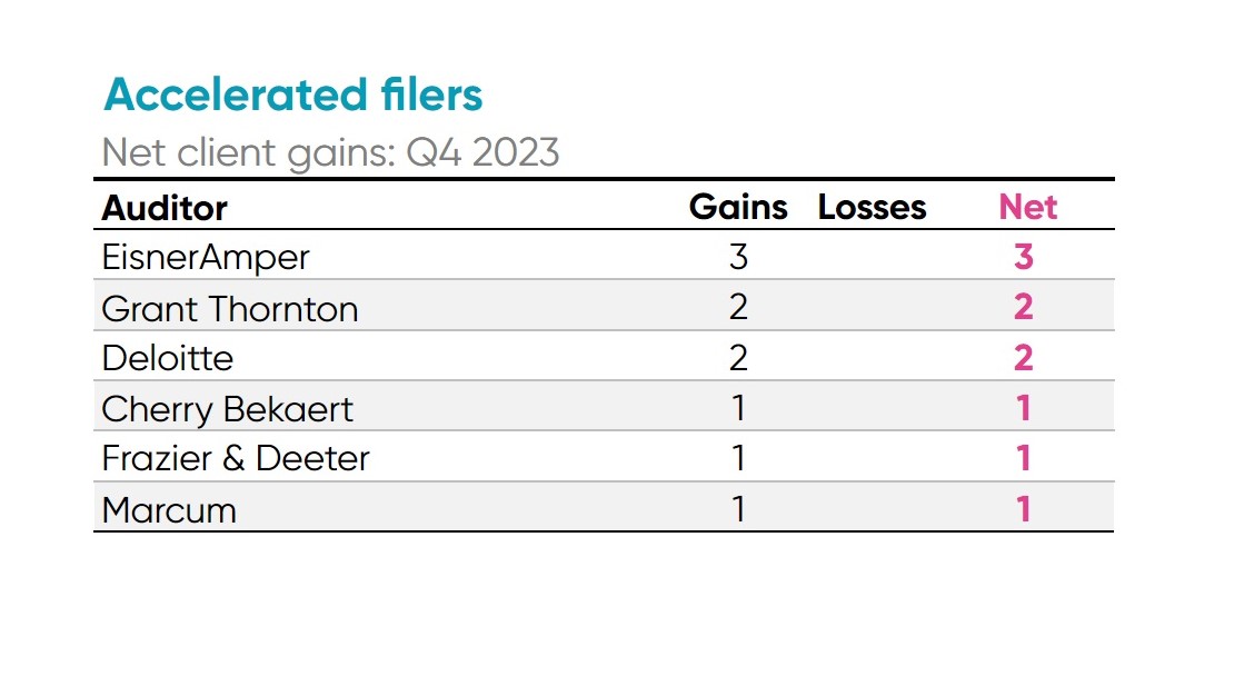 - KPMG gained the most large accelerated filer clients in Q4 with two new clients.