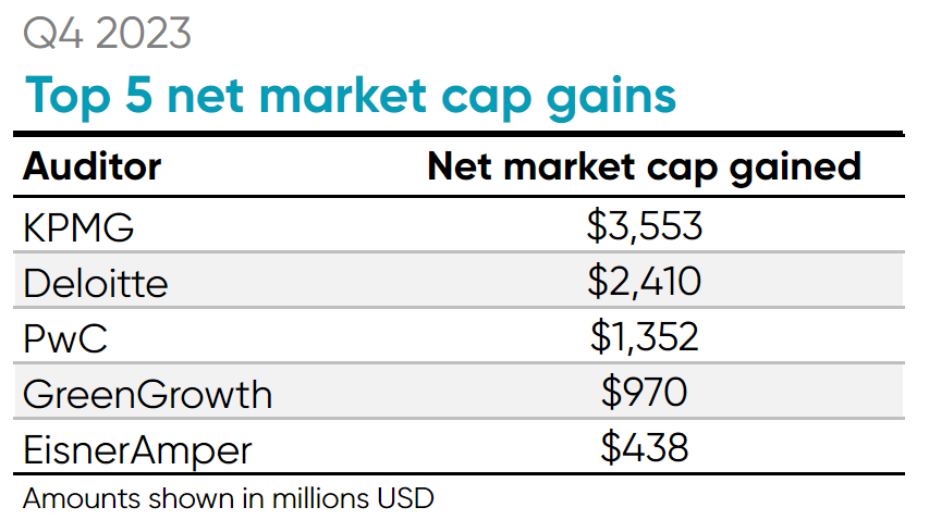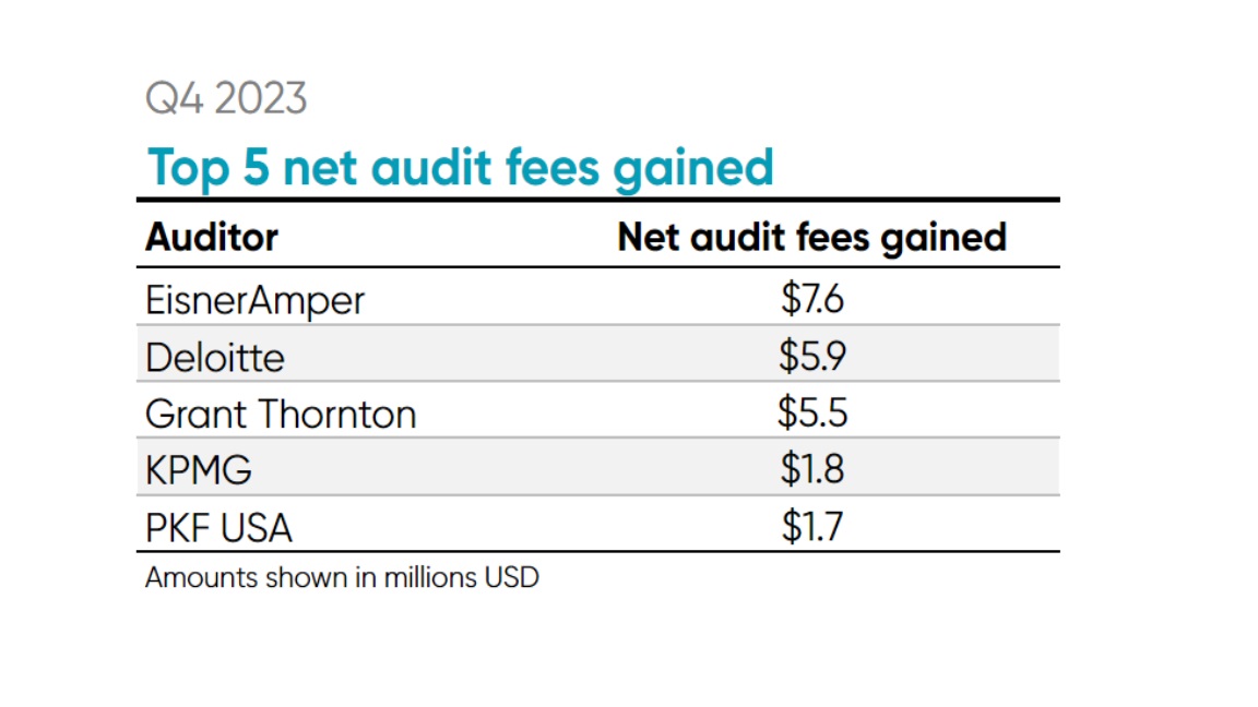 EisnerAmper saw the largest gains in terms of net audit fees in Q4 with a net gain of $7.6 million. Their new client, Exela Technologies, paid their previous auditor (KPMG) $7.2 million in audit fees for FY2022. Deloitte followed with a net gain of $5.9 million in audit fees, led by their new client Cantaloupe Inc., which paid its previous auditor (BDO) $2.4 million in audit fees for FY2023.