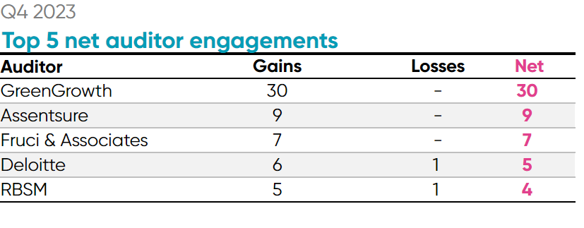 GreenGrowth CPAs led the final quarter of 2023 in terms of net SEC audit client gains, adding 30 new clients during the quarter after completing two significant mergers. In October, Gries & Associates sold its business to GreenGrowth, consequently handing over 18 of their previous clients during Q4. Additionally, Pinnacle Accountancy Group of Utah (a dba of Heaton & Company PLLC) sold a portion of its practice to GreenGrowth, adding another 11 clients to their total.