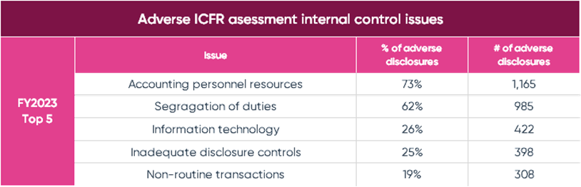 Ideagen Audit Analytics just completed our report on Internal Controls - SOX 404 disclosures. In this report we aggregate all the management reports and auditor attestation reports for Internal Controls over Financial Reporting (ICFR) for fiscal year (FY) 2023. Information Technology was in the top five for internal control issues leading to an adverse (not effective) internal control report. Overall, it was the third most cited reason. In the auditor’s reports it was #2 and in management-only reports it was #5.