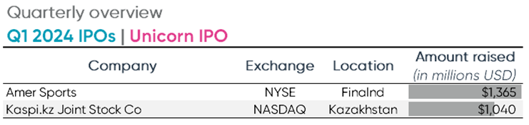 During the first quarter of 2024, there were two companies to raise over $1 billion in proceeds from their IPOs. Amer Sports, a global group of outdoor wear and sports companies based in Finland, underwent its traditional IPO in January 2024 and raised over $1.36 billion in gross proceeds. Amer Sports is known for brands including Arc’teryx, Salomon and Wilson and trades on the NYSE. The other billion-dollar IPO to take place in Q1 2024 was Kaspi.kz Joint Stock Company, which is primarily a consumer payments and marketplace fintech platform based in Kazakhstan. Kaspi.kz raised just over $1 billion in proceeds from its IPO and trades on the NASDAQ exchange.