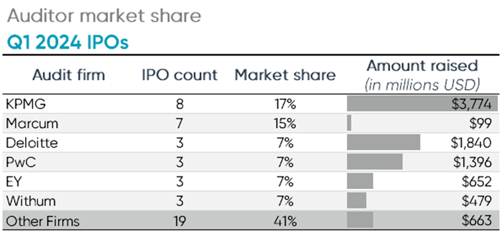 Overall, for Q1 2024 there were 20 different firms who audited the 46 newly listed companies. KPMG led the group in number of clients, auditing eight newly listed companies, representing 17% of all Q1 2024 IPOs. Marcum trailed just behind KPMG with seven new clients. KPMG also ranked number one in terms of gross proceeds with over $3.7 billion and was followed by fellow Big Four members Deloitte and PwC, each auditing three new IPO clients. KPMG audited Amer Sports and Deloitte was the auditor of record for Joint Stock Company Kaspi.kz.
