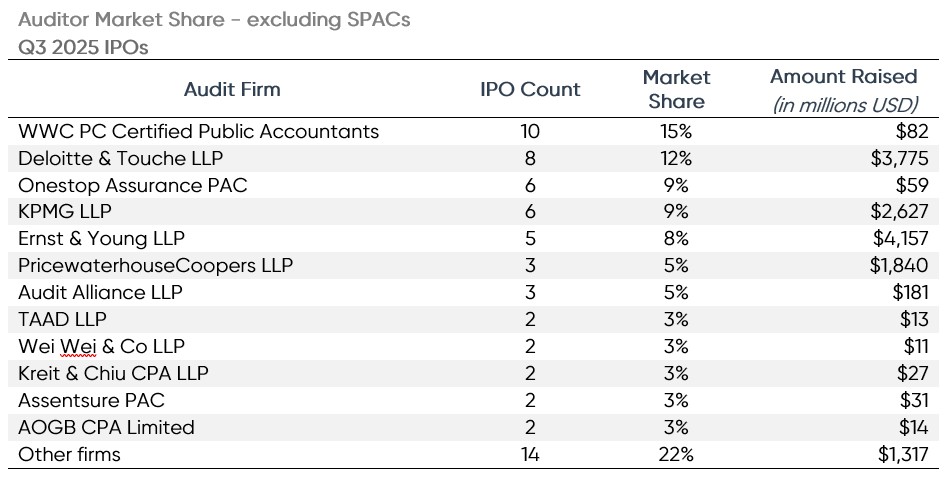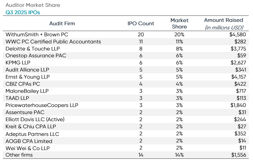 There were 31 different firms that audited the newly listed companies in Q3 2025. WithumSmith + Brown again led all auditors in terms of total IPO client count with 20 new IPO clients.  Withum individually represented 20% of all Q3 2025 IPOs. WWC PC Certified Public Accountants trailed Withum with 11 IPOs audited, while big four member Deloitte was third with eight IPOs.