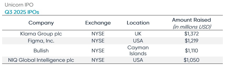 During Q3 2025, there were four companies that raised over $1 billion in proceeds from their initial public offerings.  Swedish, turned UK, fintech Klarna raised approximately $1.37 billion by selling 34.3 million shares at $40 per share, pricing above its projected $35–$37 range.  As of October 31, the shares closed at $37.98.  The majority of funds raised ($1.2 billion) went to selling shareholders.