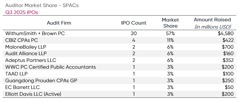 Ten different firms audited the 35 SPAC IPOs of Q3 2025. Withum, once again, was the dominant player in the SPAC IPO market, auditing 20 SPAC IPOs this quarter. Withum’s SPACs and raised a combined total of $4.6 billion in proceeds and accounted for 57% of the SPAC IPO market share this quarter.  Second was CBIZ, who acquired the former leader, Marcum, and audited 4 SPAC IPO’s.