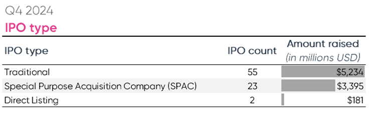 Traditional IPOs, once again, constituted the majority of the public offerings this quarter. There were 55 traditional IPOs, representing 69% of total public offerings for the quarter, nearly identical to the proportion of traditional IPOs in Q3 2024.