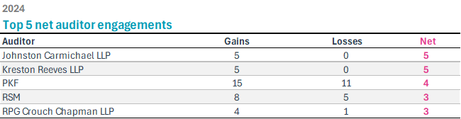 Overall, there were 154 different companies listed on the London Stock Exchange (including the AIM sub-market) that experienced an auditor change in 2024. Net gains were led by Johnston Carmichael LLP and Kreston Reeves LLP, both at a net of five.
