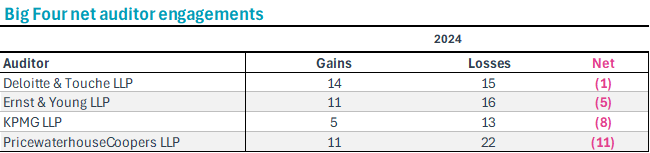 There continues to be heavy competition among these four firms. In 2024, Big Four firms engaged by LSE companies were still most frequently replacing other Big Four firms. However, the Big 4 disclosed 44% of their losses to firms outside of their group.