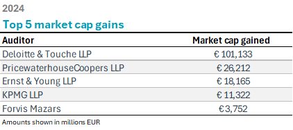 Deloitte & Touche was the leader in LSE client market cap gains in 2024, totaling €101.1 billion.