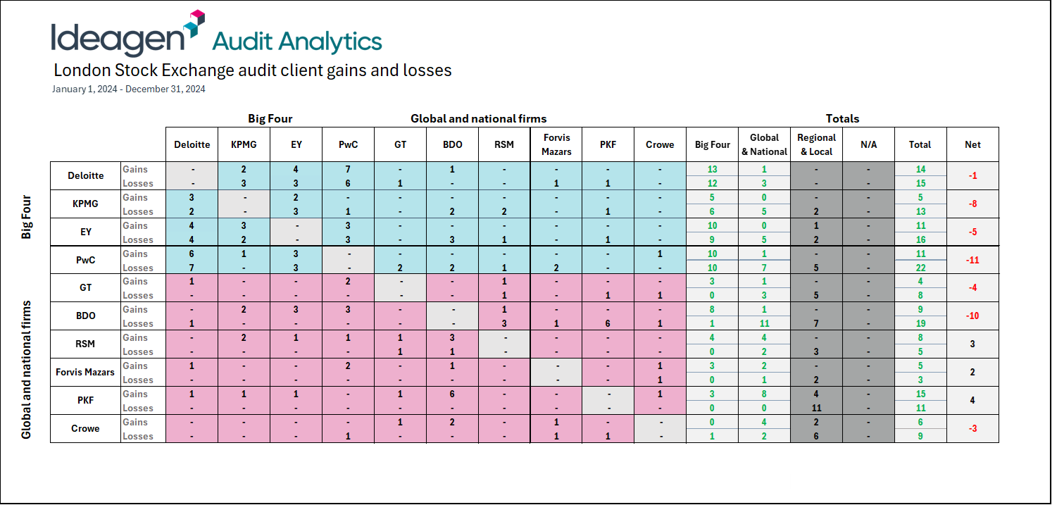 All Big Four firms experienced net losses in LSE clients in 2024. PricewaterhouseCoopers (PwC) saw the largest net loss with 11 clients departing overall. KPMG followed with a net loss of 8 clients, while Ernst & Young (EY) lost 5 clients net. Deloitte had the smallest net loss among the Big Four with just 1 client.