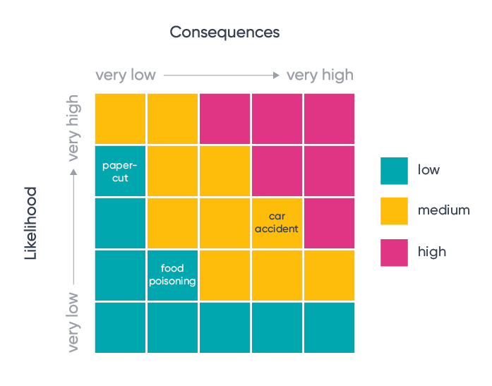 Then there is the possibility of a car accident. If this is a major incident, the consequences would be far worse than either a papercut or a stomach upset. For that reason, the overall risk is medium. That’s why we need driver’s licenses, insurance, and seatbelts. In other words, actions that seek to mitigate the risk.