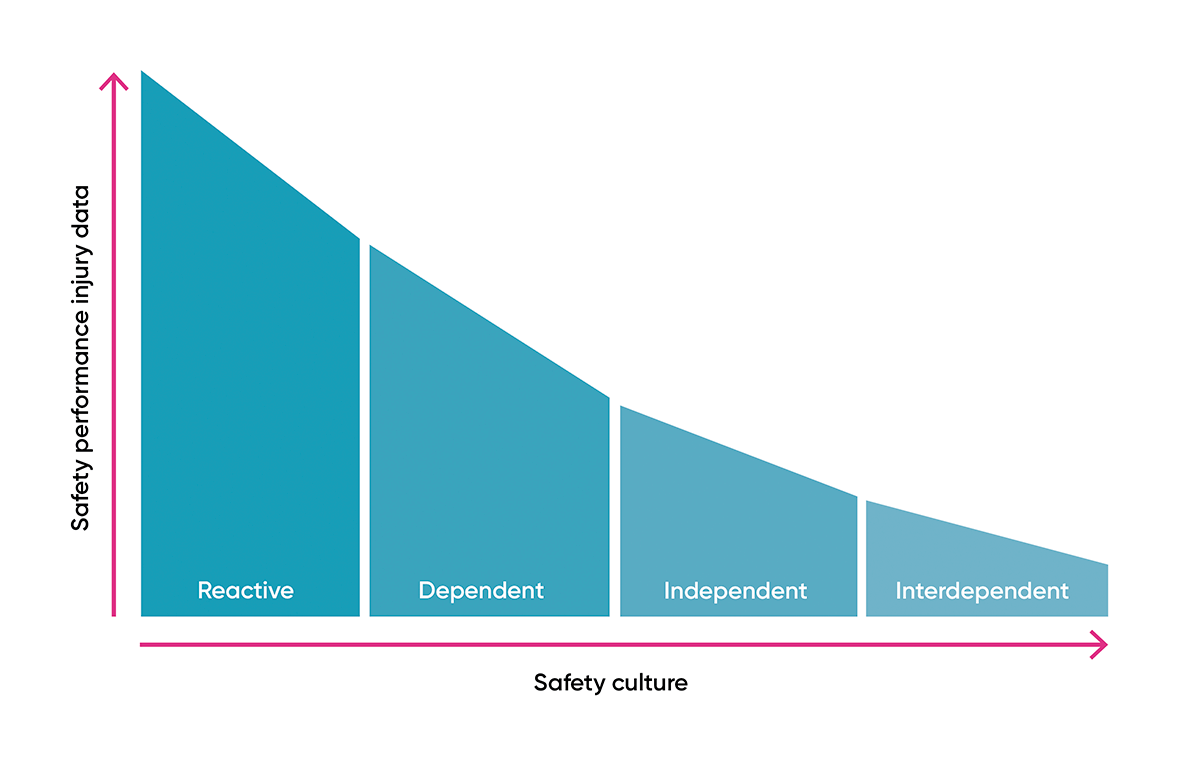 These ideals of interdependence vary greatly from the reactive and dependent stages that are marked by measuring lagging indicators, lack of responsibility for safety, an attitude of “accidents happen,” rule following and minimal manager involvement in safety.