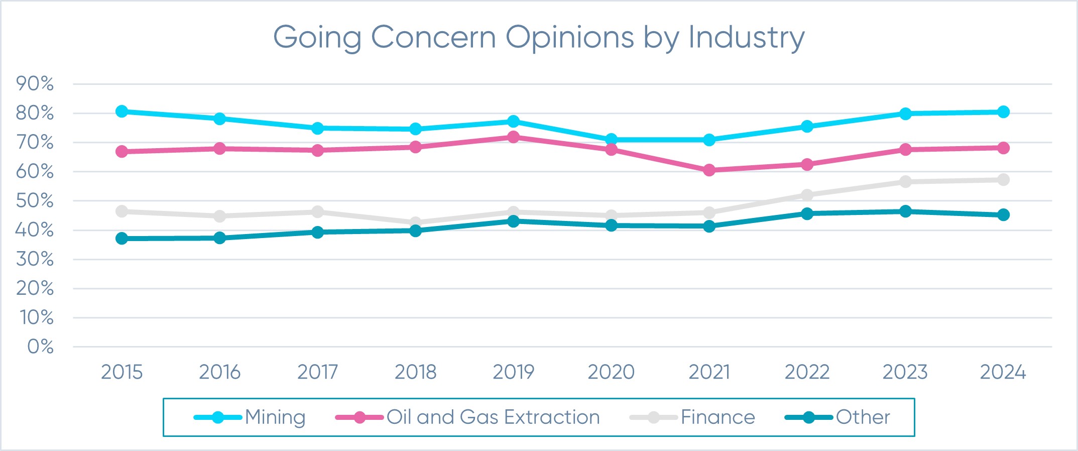 The mix of companies in Canada is quite different between exchanges and overall is quite different from what we see in our SEC analysis. The top three industries on the Canadian exchanges for Going Concern opinions make up 71% of all FY2024 opinions:
