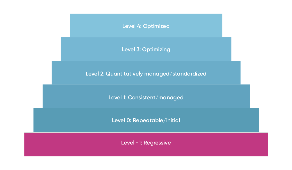 Level 1: consistent/managed: Here, the organization has established consistent processes. There is regular compliance with quality standards and accountability for quality management has been assigned.