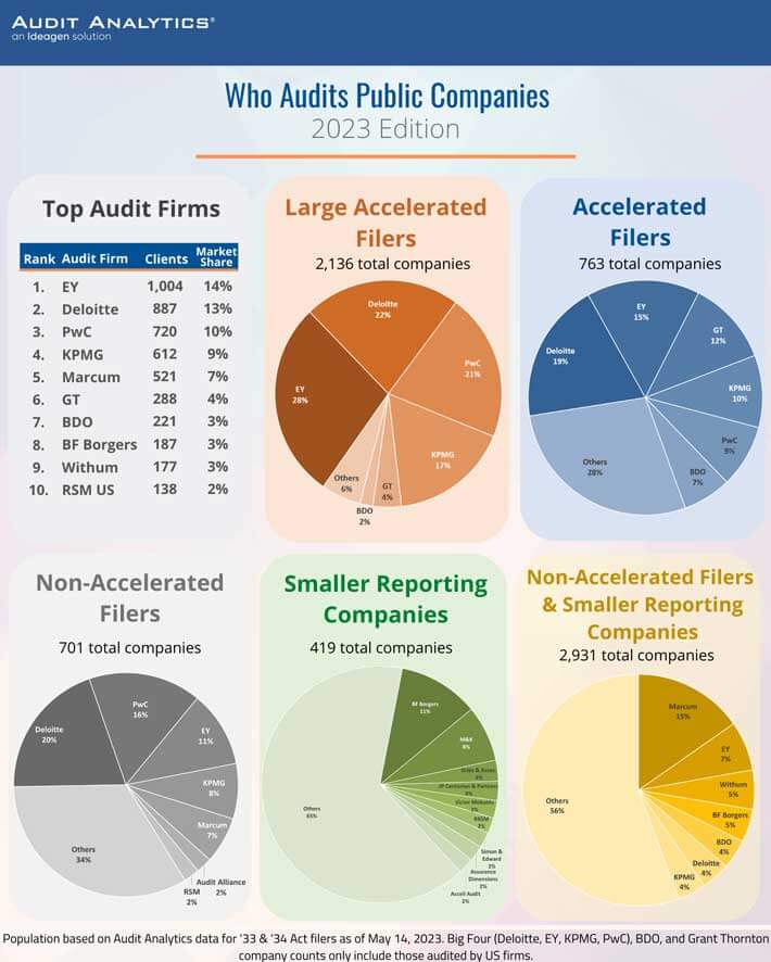 This is Ideagen Audit Analytics' annual market share analysis of auditor engagements for public companies as of May 14, 2023. Using our auditor engagements data, we look at who is currently conducting audits of Securities and Exchange Commission (SEC) public registrants, based on periodic reports filed with the SEC after March 1, 2022.