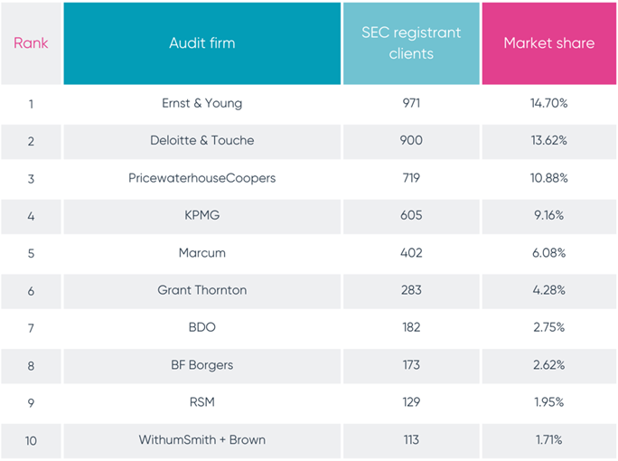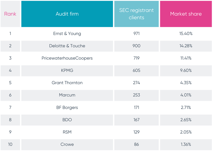 The auditors with the most SEC registrant clients, including SPACs, were EY, Deloitte, PwC, KPMG, Marcum, Grant Thornton, BDO, BF Borgers, RSM and Withum. With a slight shift in order, the top ten firms by registrant count remain unchanged from the previous year.