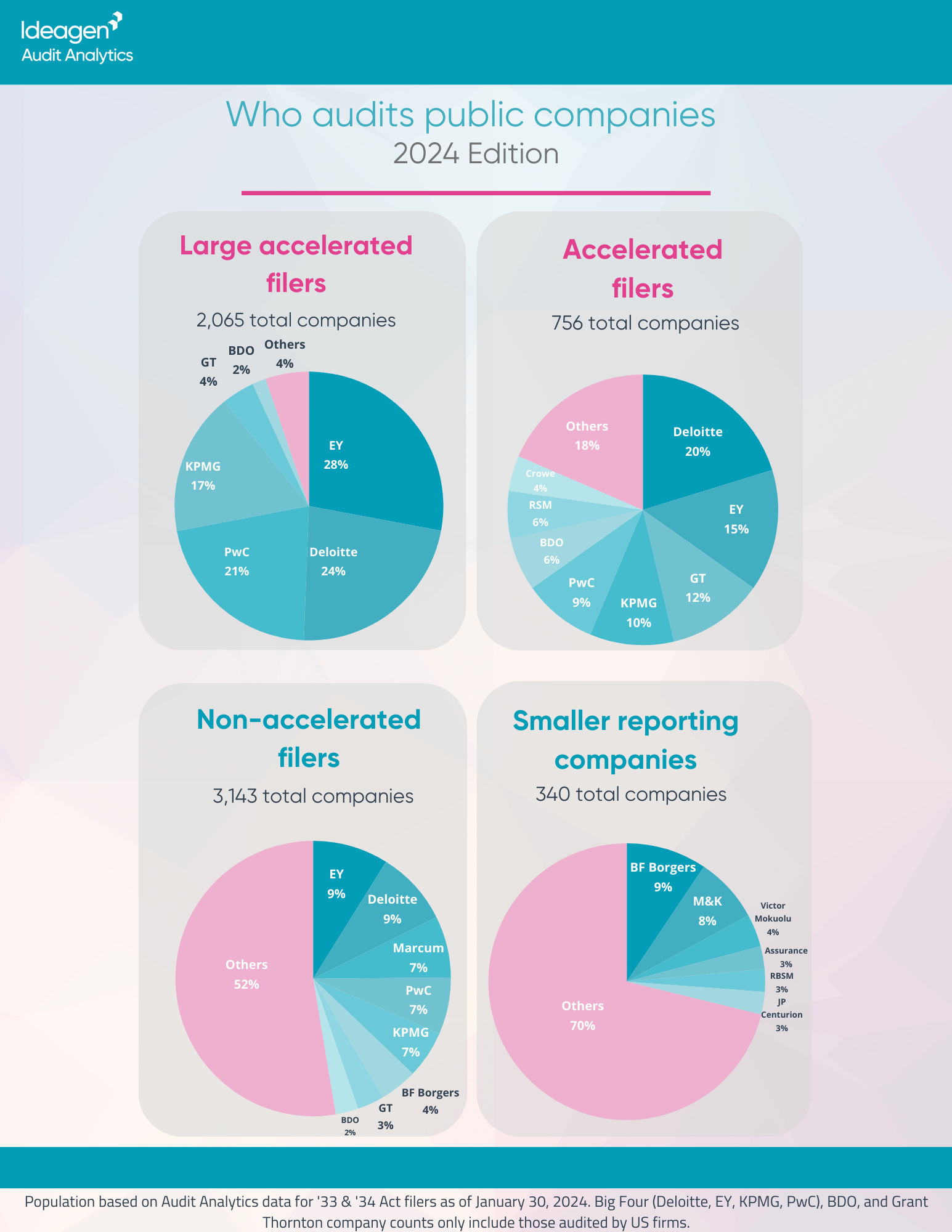 This is Ideagen Audit Analytics’ annual market share analysis of auditor engagements for public companies as of January 30th, 2024. Using our Auditor Engagements data, we look at who is currently conducting audits of SEC public registrants, based on periodic reports filed with the SEC.